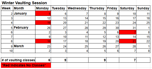 - Dates in red indicate no class is scheduled for that day.